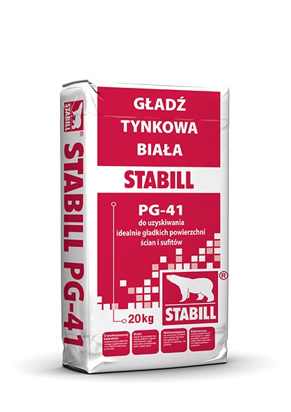 STABILL PG–41 jest suchą mieszanką gipsu naturalnego, polimerów i wypełniaczy mineralnych modyfikowanych najwyższej jakości dodatkami. Zmieszana z wodą tworzy plastyczną, wolnowiążącą masę o dobrej przyczepności, łatwą w stosowaniu. Po aplikacji, związaniu i wyschnięciu uzyskuje twardą, odporną na zarysowania i bardzo gładką powierzchnię. Może być malowana farbami stosowanymi do podłoży mineralnych a także pokrywana tapetami. Wysoki stopień białości i gładkość uzyskanej powierzchni ułatwia malowanie i pozwala obniżyć jego koszty.